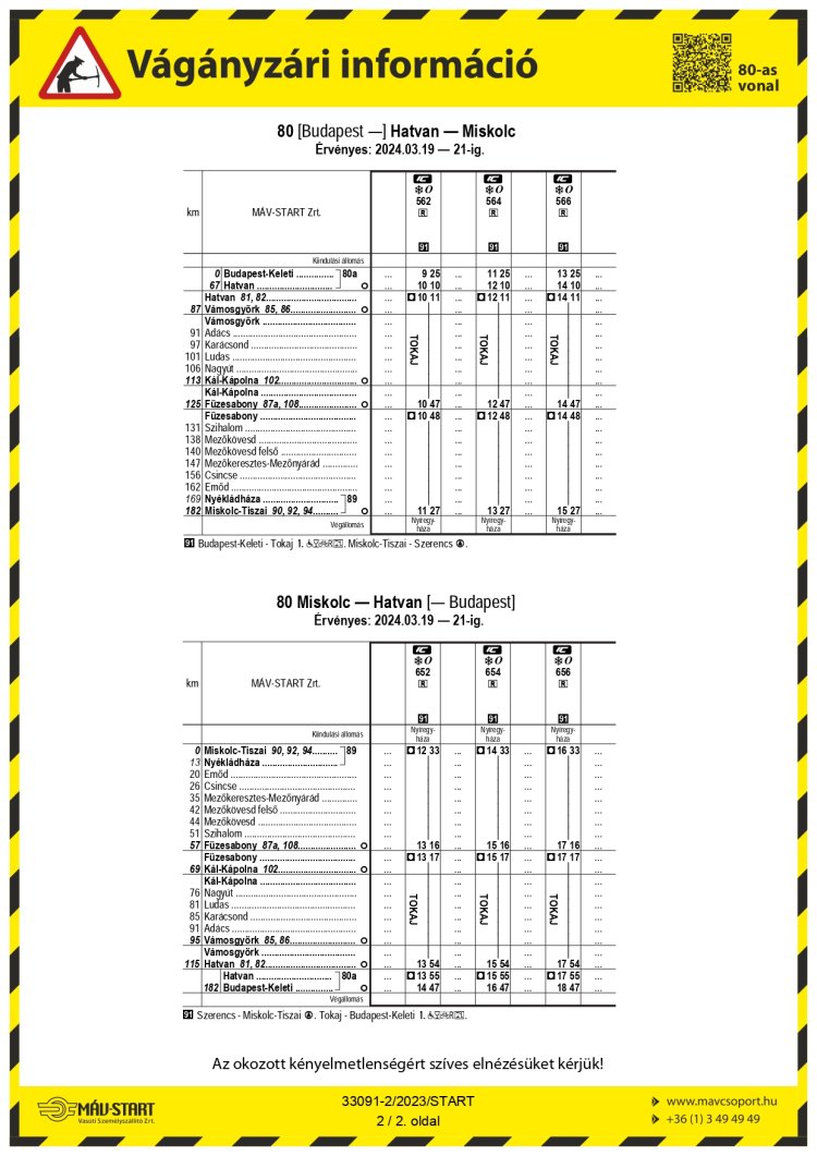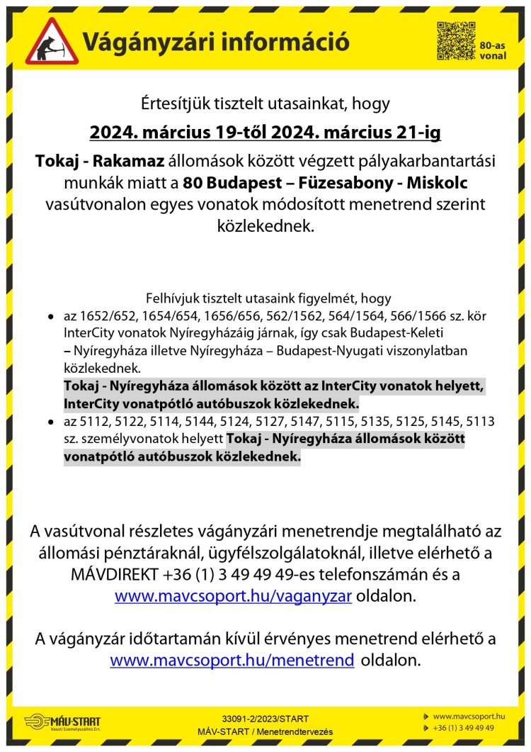 Március 19. és 21-e között Tokaj-Rakamaz állomások között pályakarbantartási munkálatokat végeznek ami a 100c (Miskolc)-Szerencs-Nyíregyháza vasútvonalat is érinti.