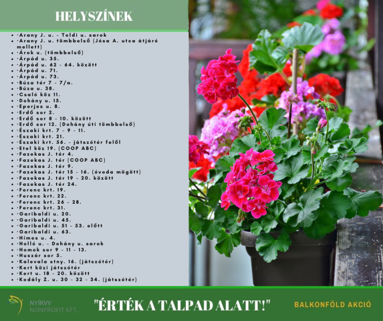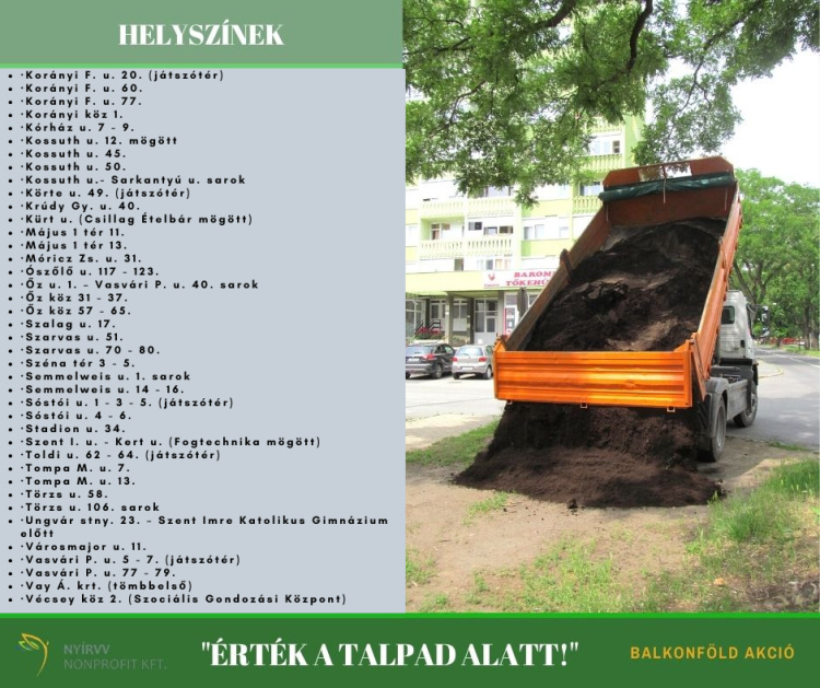 Az idei évben a NYÍRVV Nonprofit Kft. 143 m3 balkonföldet helyez ki a társasházi lakóövezetekbe, helyszínenként 0,5 - 4 m3 mennyiségben, összesen 81 helyszínre. A kijuttatott komposztos termőföldkeveréket virágok átültetéséhez, balkonládák beültetéséhez használhatják fel a városlakók.