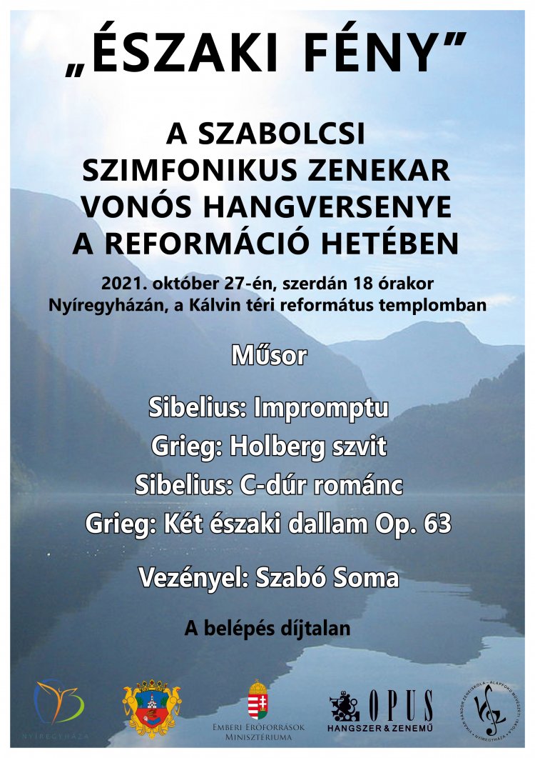 Október 27-én, a Reformáció hetében ad vonós hangversenyt a Szabolcsi Szimfonikus Zenekar Nyíregyházán, a Kálvin téri református templomban. Műsoron Sibelius, Grieg művei.