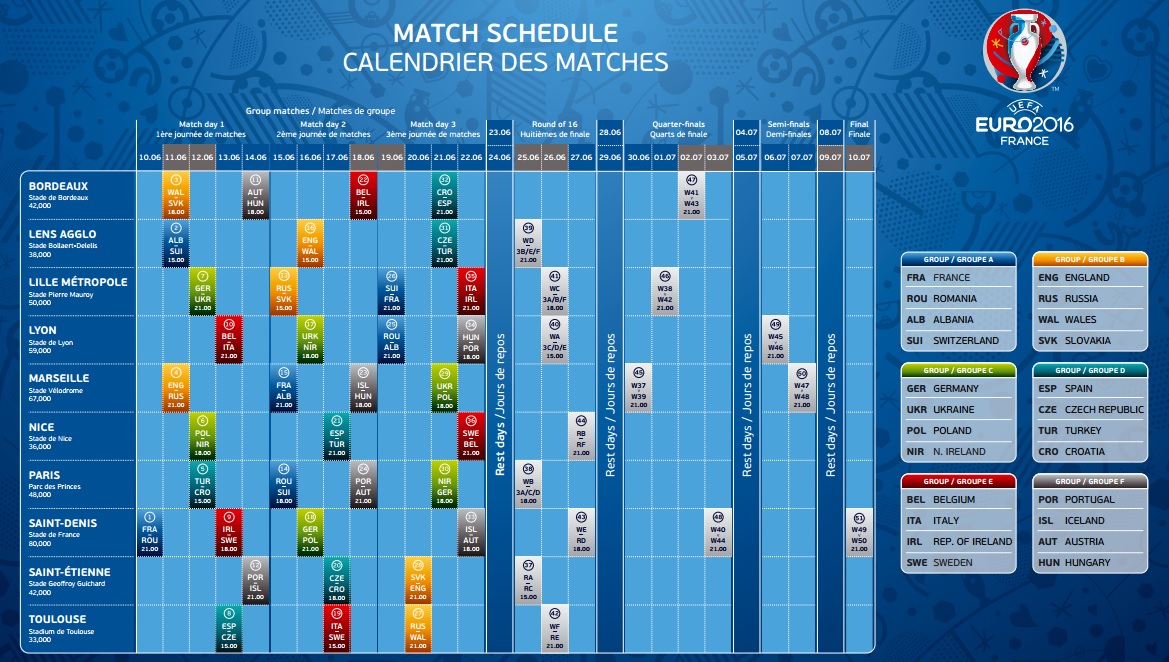 Június 13. 21.00 Belgium–Olaszország Lyon, Stade des Lumieres