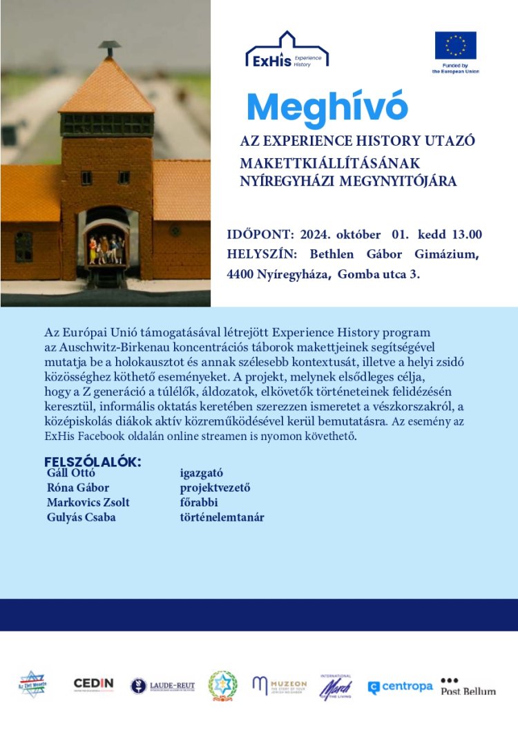 Az Európai Unió támogatásával létrejött Experience History program az Auschwitz-Birkenau koncentrációs táborok makettjeinek segítségével mutatja be a holokausztot és annak szélesebb kontextusát, illetve a helyi zsidó közösséghez köthető eseményeket. A projekt, melynek elsődleges célja, hogy a Z generáció a túlélők, áldozatok, elkövetők történeteinek felidézésén keresztül, informális oktatás keretében szerezzen ismeretet a vészkorszakról, a középiskolás diákok aktív közreműködésével kerül bemutatásra. Az esemény az ExHis Facebook oldalán online streamen is nyomon követhető.
