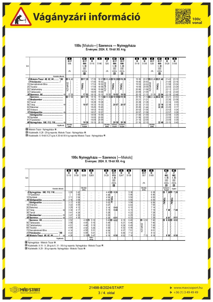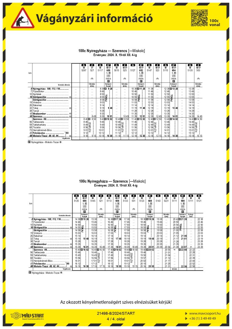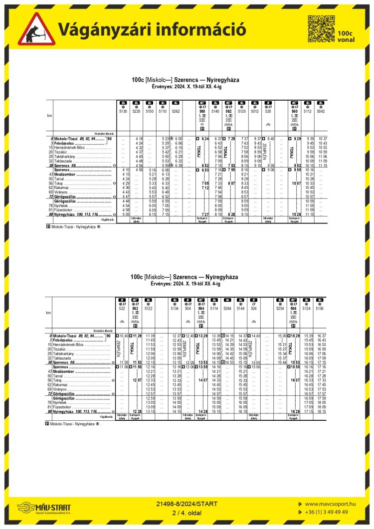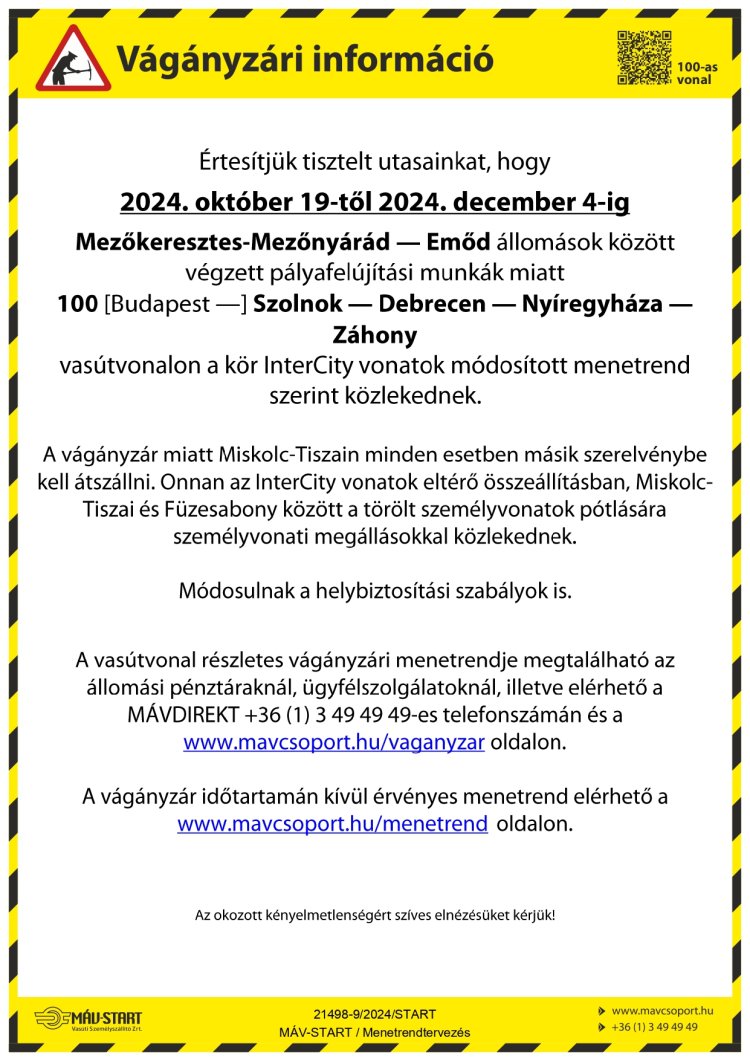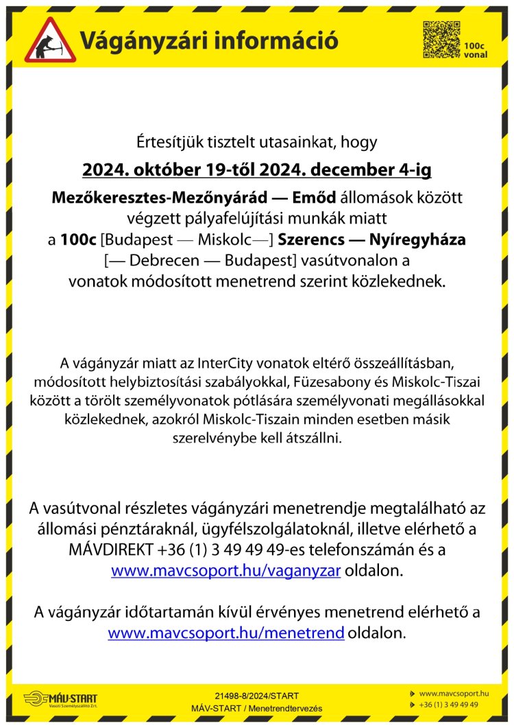 2024. október 19-től december 4-ig Mezőkeresztes-Mezőnyárád - Emőd állomások között felújítás miatt vágányzár lép életbe. A rekonstrukció a 100 és 100c vonalon közlekedő szerelvényeket is érinti. Kérik az utasokat, hogy utazás előtt tájékozódjanak a járatokról!