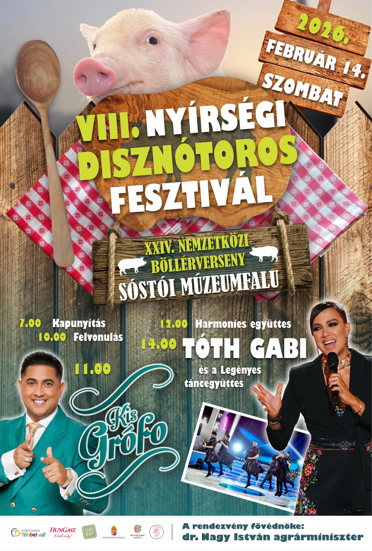 Február 14-én, szombaton ismét a disznótoré lesz a főszerep a nyíregyházi Sóstói Múzeumfaluban, ahol nyolcadik alkalommal rendezik meg a Nyírségi Disznótoros Fesztivált. A nap már délelőtt 11 órakor elindul, amikor színpadra lép a Kis Grófo, hogy megalapozza a jókedvet és a vastapsot.