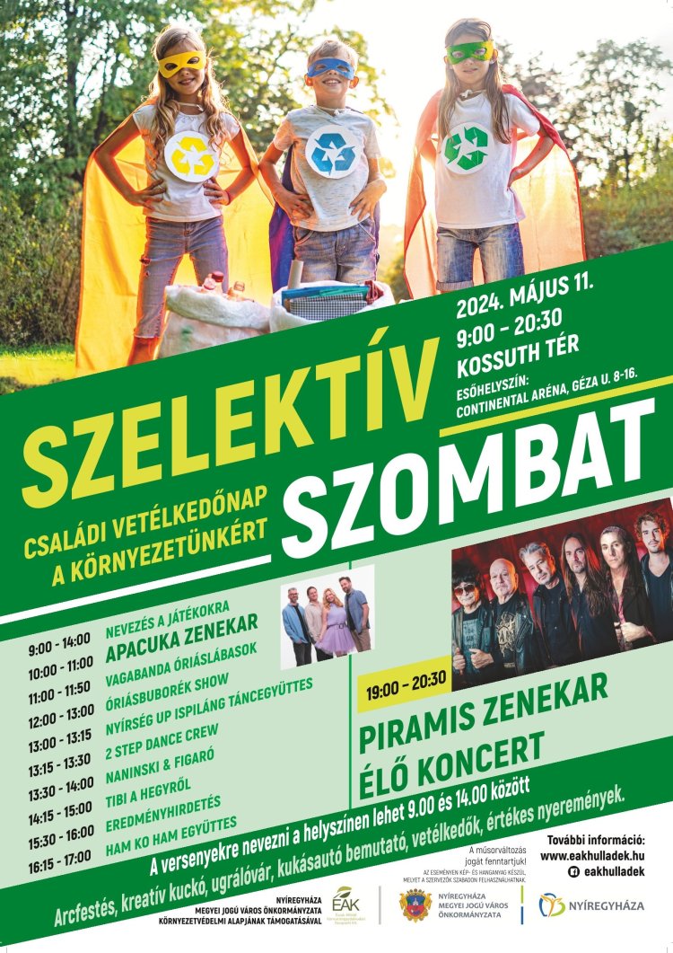 Május 11-én ismét megrendezik a „Szelektív Szombat” elnevezésű családi vetélkedőnapját, amelynek fókuszában a szelektív hulladékgyűjtés népszerűsítése áll. A programot Nyíregyháza Megyei Jogú Város Önkormányzata, valamint az ÉAK Nonprofit Kft. szervezi. A rendezvény helyszíne Nyíregyháza város szíve, a Kossuth tér lesz. (Esőhelyszín: Continental Aréna, Nyíregyháza, Géza u. 8-16.)
