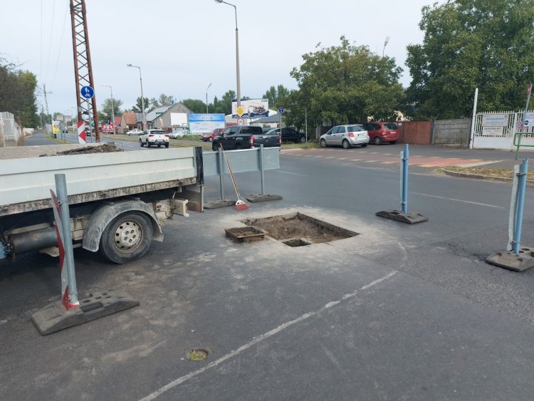 Egy csapadékelvezető fedlap szintbe helyezése nehezíti a közlekedést a Kállói út és a Lujza utca csomópontjában.