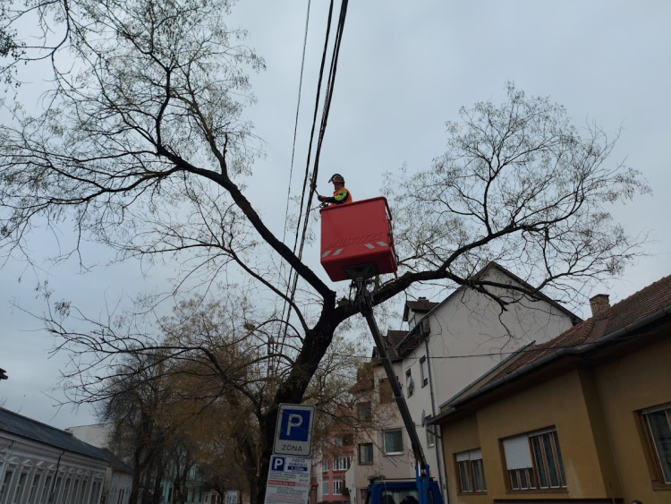 Az elektromos vezetékre hajló faágakat vágták, metszették a Bethlen Gábor utcán.