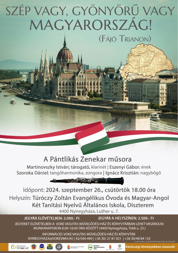 A Pántlikás Zenekar Szép vagy, gyönyörű vagy Magyarország (Fájó Trianon) címmel zenés műsort ad a Thúróczy Zoltán Evangélikus Óvoda és Két Tanítási Nyelvű Általános Iskola Dísztermében szeptember 26-án a Luther utca 7. szám alatt.