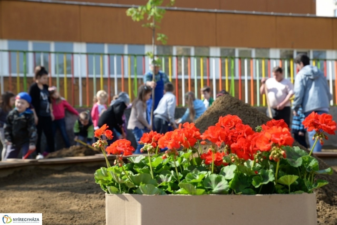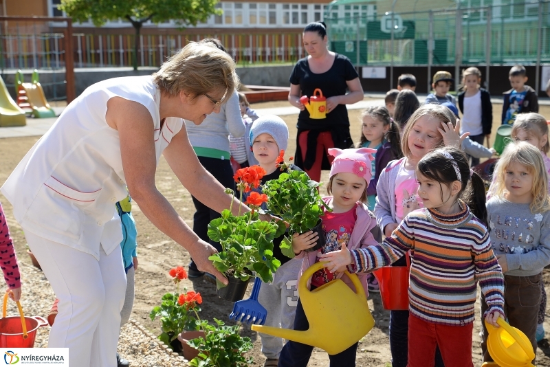 A gyerekek az óvoda udvarán konyhakerti növényeket is ültettek, zöldhagymát, koktélparadicsomot, paprikát és retket, amit később majd uzsonnaként el is fogyasztanak. A virágcserepekbe pedig 100 tő muskátli került, amit szintén a kicsik gondoznak majd.