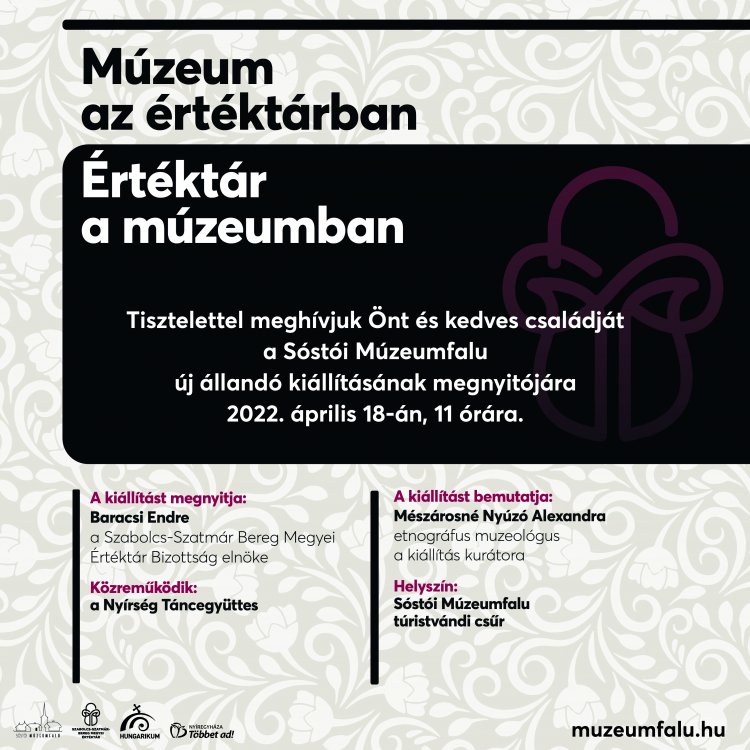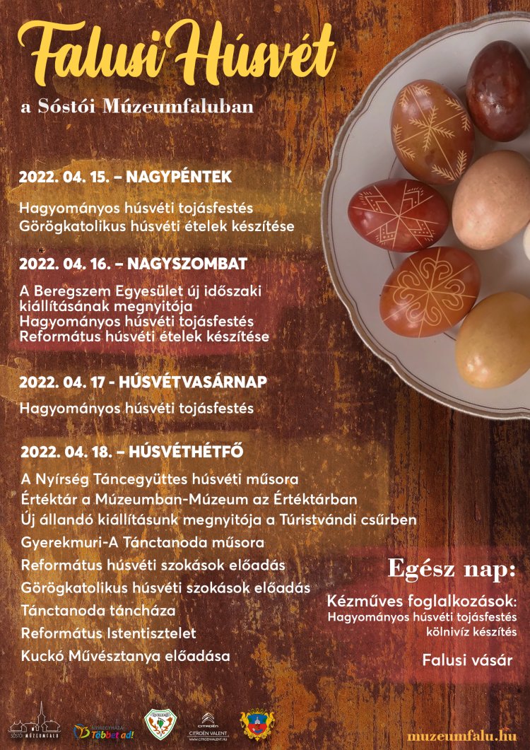 A nagyhét utolsó napjaiban a hagyományos tojásfestést próbálhatják ki gyermekek és felnőttek egyaránt, illetve megismerkedhetnek a görögkatolikus és református húsvéti ételekkel. A böjti elcsendesedés után húsvéthétfőn a Nyírség Táncegyüttes várja 10.30-kor az érdeklődőket a jánkmajtisi portára, tánccal, énekkel és természetesen hagyományos locsolással. A Túristvándi csűrben 11.00 órakor új állandó kiállítás nyitja meg kapuit a nagyközönség előtt, Értéktár a múzeumban - Múzeum az értéktárban címmel. A Megyei Értéktár gyöngyszemeit méltatja a kiállítás, méltó helyre emelve ezzel Szabolcs-Szatmár-Bereg megye megszámlálhatatlan kincsét. A Múzeumfaluba látogató családok számára több programmal is kedveskedünk, 12.30-kor az Ákom-Bákom BáBcsoport, 15.00 órától pedig a Kuckó Művésztanya szórakoztatja a faluközpontban a színpadon a közönséget. Az érdeklődők 12.00 és 13.00 órakor a református és görögkatolikus húsvéti szokásokkal is megismerkedhetnek, valamint 14.00 órakor a templomban református istentiszteleten vehetnek részt. A Tánctanoda lelkes táncosai a színpadon is bemutatkoznak, 13.30-kor pedig táncházba és locsolkodásra hívják a Múzeumfalu látogatóit, melynek helyszíne a faluközpont. Hajdu Ágota tavaszi falujárásra invitálja a lányokat. Az Újlétai Magtárban minden ügyes kéz megtalálhatja a kedvére való tevékenységet, kölnivíz készítésre, tojásfestésre és tojásgyűjtő táska készítésére is lesz lehetőség. Az Anarcsi portán húsvéti ételkóstoló, a Temetőcsősznél gyógytea, a Nyitott szín alatt pedig szamoskéri töltöttkáposzta vár mindenkit. Lesz még kosaras körhinta, népi játékok, szövés, íjászat és falusi vásár, mert a Sóstó Múzeumfaluban élmény a hagyomány!
