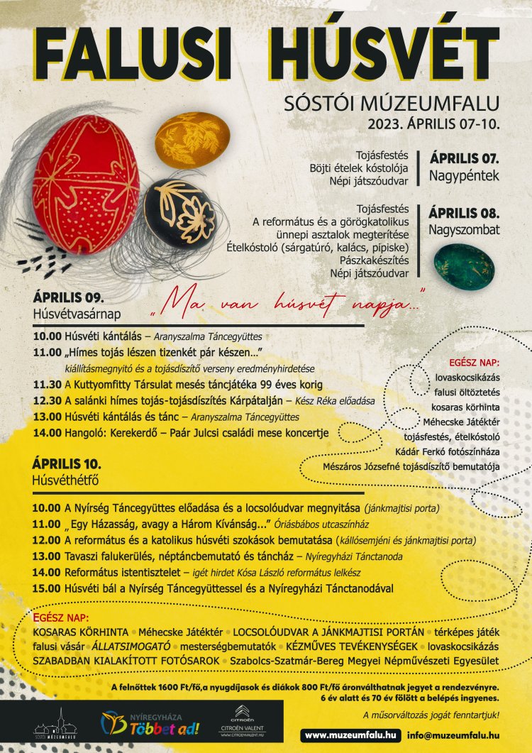 A kereszténység egyik legnagyobb ünnepén, a tavasz első hagyományos falusi eseményén, számtalan programmal kedveskednek az érdeklődőknek. A nagyhét utolsó napjaiban, nagypénteken és nagyszombaton a hagyományos tojásfestést próbálhatják ki gyermekek és felnőttek egyaránt. Kóstolhatnak böjti ételeket, valamint megismerkedhetnek a görögkatolikus és református húsvéti ételekkel is. A böjti elcsendesedés után idén először már húsvétvasárnap is lesznek fellépők a faluközpontban, ugyanis vendégül látják a felvidéki Kuttyomfitty Társulatot és az önálló családi mesekoncertját bemutató Paár Julcsit és zenekarát. Az Aranyszalma Táncegyüttes kamaracsoportja feleleveníti a Szatmárban ismert húsvéti kántálást. Kész Réka, a debreceni egyetem Történelem és Néprajzi Doktori Iskola PhD hallgatója, szűkebb hazájának, a kárpátaljai Salánknak mutatja be a hímestojásait, a tojásdíszítés szimbolikáját. Húsvétvasárnap ellátogat a skanzenbe Kádár Ferkó és fotószínháza, akinek jóvoltából különleges fényképekkel gazdagodhatnak a látogatók. Húsvéthétfőn a Nyírség Táncegyüttes 10.00-kor nyitja meg a locsolóudvart a jánkmajtisi portán, természetesen tánccal, énekkel és hagyományos locsolással. Idén először ezen a napon, minden látogató részese lehet az ősi termékenységvarázslás emlékeit őrző húsvéti locsolásnak. A lányok részéről bátorságra és hímes tojásra, a vállalkozó szellemű legények részéről pedig egy nagyszerű locsolóversre lesz szükség. Minden órában csatlakozhatnak a Nyírség, illetve a Tánctanoda néptáncosainak csapatához, hogy újra átélhessék a hagyományos locsolkodás élményét. A faluközpontban 11.00 órakor Óriásbábos Utcaszínház várja a családokat. Az érdeklődők a református és görögkatolikus húsvéti szokásokkal is megismerkedhetnek, valamint 14.00 órakor a templomban református istentiszteleten vehetnek részt. A Tánctanoda lelkes táncosai a színpadon is bemutatkoznak, emellett pedig tavaszi falukerülésre és táncházba is hívják a Múzeumfalu látogatóit, melynek helyszíne a faluközpont. Minden ügyes kéz megtalálhatja a kedvére való kézműves tevékenységet. Vendégül látják a Szabolcs-Szatmár-Bereg Megyei Népművészeti Egyesület alkotó népművészeit, akik bemutatóikkal színesítik a rendezvényt. A kocsmaudvaron húsvéti ételkóstoló, a Temetőcsősznél gyógytea vár mindenkit. Lesz még kosaras körhinta, népi játékok sokasága, lovaskocsikázás, mesterségbemutató, térképes játék és falusi vásár is, mert a Sóstó Múzeumfaluban élmény a hagyomány!