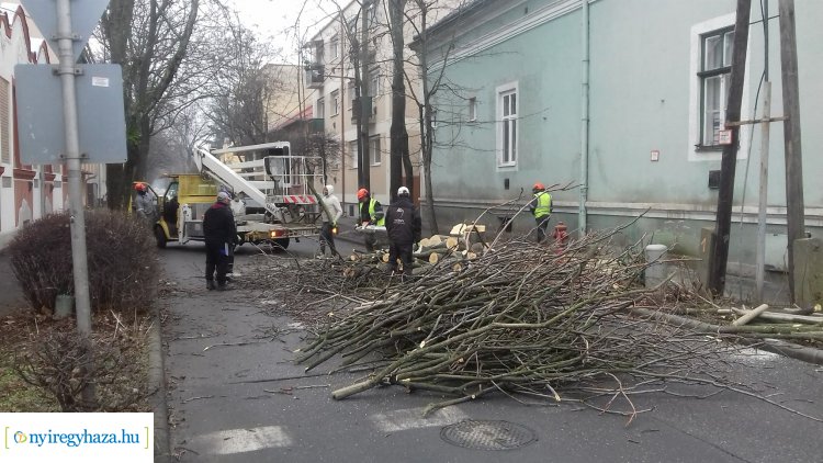 Favágási munkálatokat végeznek kedden a NYÍRVV munkatársai a Deák Ferenc utcán