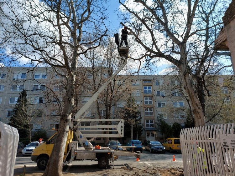 A Vasvári Pál utcán a NYÍRVV szakemberei egy elszáradt platánfa ágait távolították el emelőkosaras kocsiból, az ott lakók kérésére.