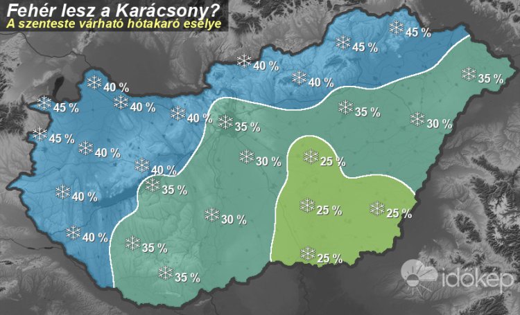 Az jelen előrejelzések szerint az Északi-középhegységben 45 százalék, míg nyugaton és a főváros környékén 40 százalékos eséllyel ropoghat némi hó a lábunk alatt karácsonykor. Délkelet felé haladva ennek esélye egyre inkább csökken.