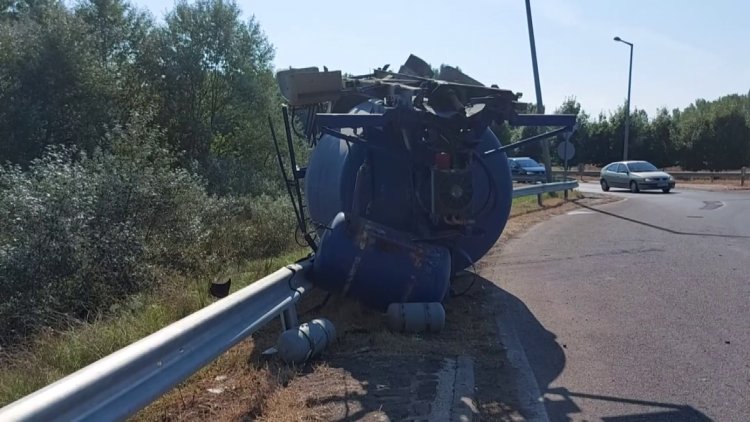Felborult egy kevert betont szállító mixer egy körforgalomban