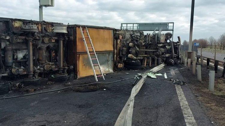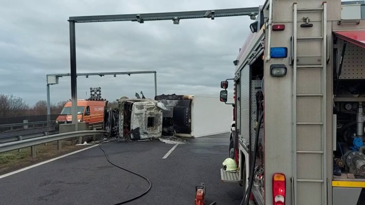 Felborult és kigyulladt egy külföldi kamion az M3-as autópályán, a nyíregyházi pihenőnél.