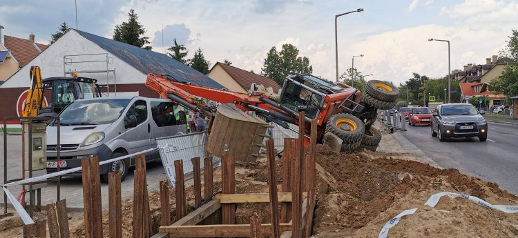 Baleset történt a Korányi Frigyes utcán az épülő körforgalomnál. Közműkiváltásokat végeznek, és az egyik munkagép a laza talajon megcsúszott, és oldalára billent. A mellette álló kisbusz is megsérült. A műszaki mentés idejére a forgalmat lezárták, és a tűzoltók emelték vissza a munkagépet.