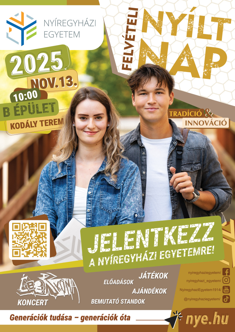 A Nyíregyházi Egyetem 2025. november 13-án, csütörtökön 10 órától rendezi meg Felvételi Nyílt Napját a B épület Kodály Termében. Az eseményen a résztvevők átfogó képet kaphatnak az intézmény képzési kínálatáról, a hallgatói életről és az újonnan induló szakokról.