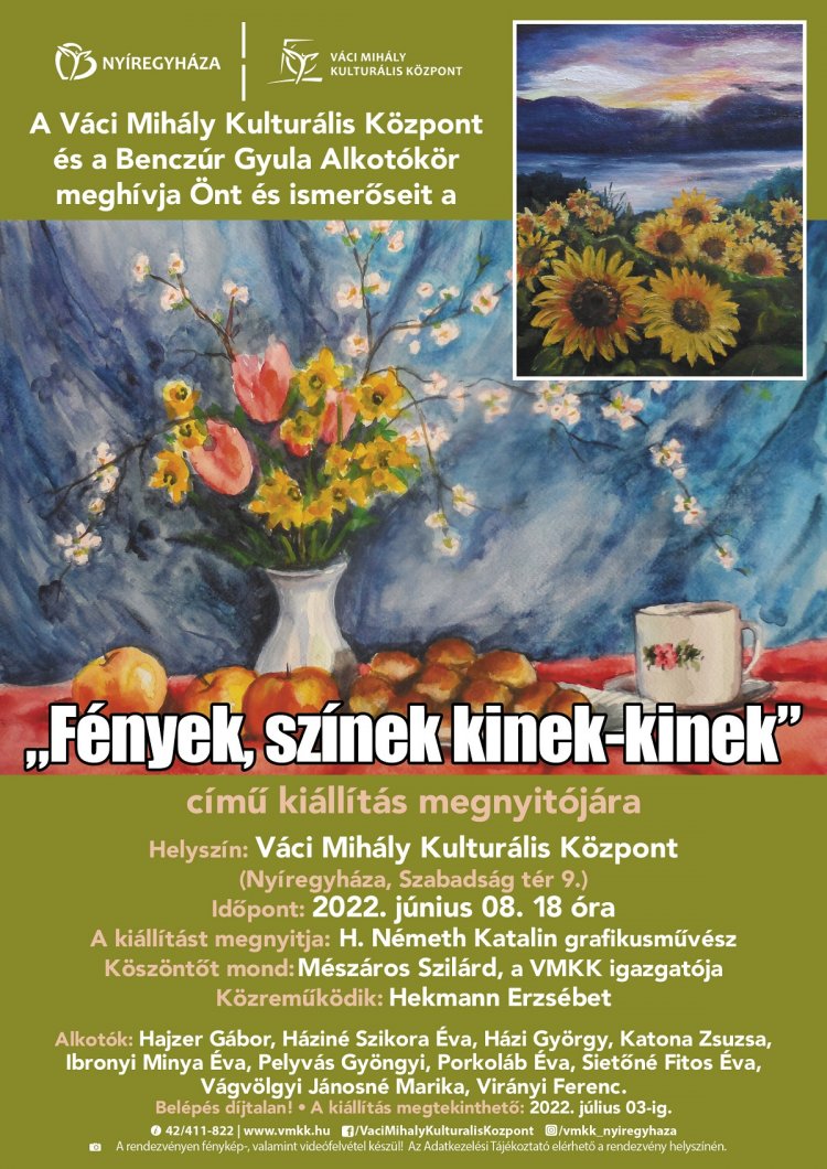 A Benczúr Gyula Alkotókör tagjai mutatkoznak be alkotásaikkal a Váci Mihály Kulturális Központban, június 8-tól. A Fények, színek kinek-kinek című tárlat július 3-ig látogatható.