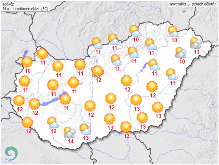 A ködös tájakon gyorsan javulnak a látási viszonyok, valamint a rétegfelhőzet is zsugorodik, feloszlik, így jórészt mindenütt gyengén felhős, napos időre számíthatunk csapadék nélkül. A légmozgás többnyire mérsékelt marad. A legmagasabb nappali hőmérséklet 9 és 14 fok között várható. Késő estére általában 1 és 7 fok közé hűl le – közli az Országos Meteorológiai Szolgálat pénteki előrejelzésében.