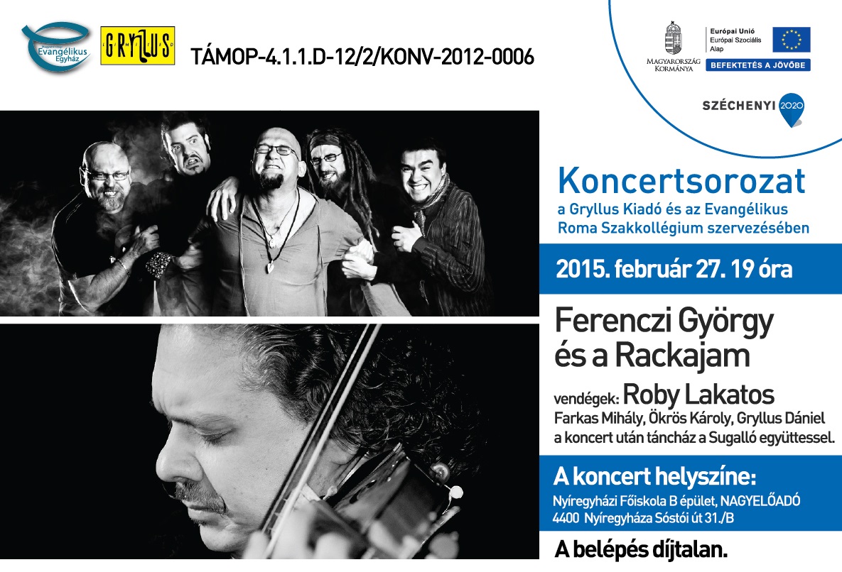 Az Evangélikus Roma Szakkollégium olyan ingyenes koncerttel ajándékozza meg a város kultúra-szerető, művészetbarát közönségét, melyen rangos előadók lépnek közönség elé.Folytatva a Keresztény Roma Szakkollégiumi Hálózatban megkezdett hagyományt - mint előző évi nyertes -, az Evangélikus Roma Szakkollégium február utolsó napjaiban Nyíregyházán rendezi meg a KRSZH közösségi alkalmat (február 27-én) és Focikupát (február 28-án). Ennek keretében, az Evangélikus Roma Szakkollégium ismét olyan ingyenes koncerttel ajándékozza meg a város kultúra-szerető, művészetbarát közönségét, melyen rangos előadók lépnek közönség elé.