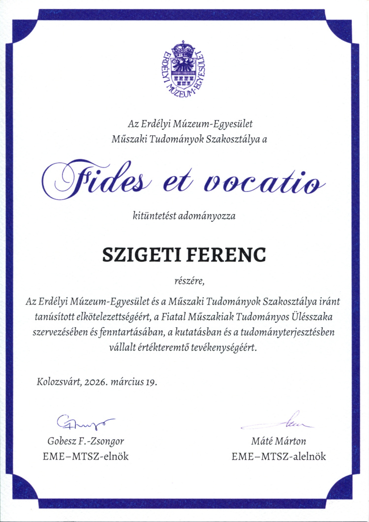 Szigeti Ferenc az elismerést az Erdélyi Múzeum-Egyesület Műszaki Tudományok Szakosztálya iránt tanúsított elkötelezettségéért, a Fiatal Műszakiak Tudományos Ülésszaka szervezésében és fenntartásában végzett munkájáért, valamint a kutatásban és a tudományos ismeretterjesztésben vállalt értékteremtő tevékenységéért kapta.