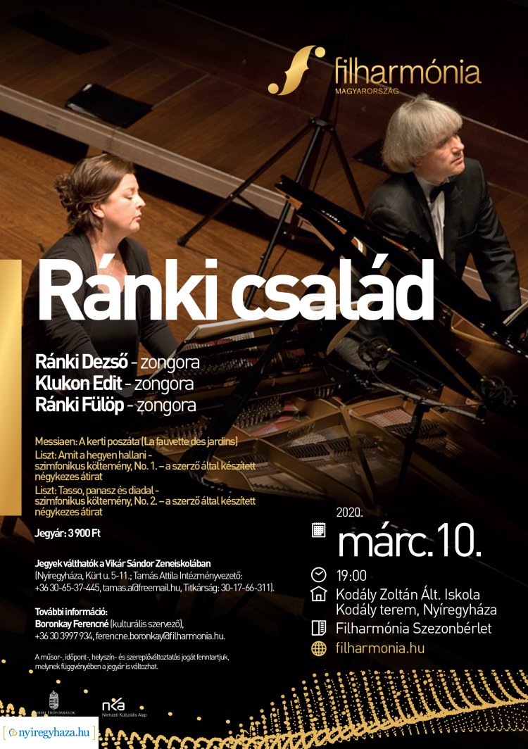 A Filharmónia Magyarország nyíregyházi hangversenysorozata Ránki Dezső, Klukon Edit és Ránki Fülöp zongoraestjével folytatódik, március 10-én. Műsoron Messiaen- és Liszt-művek szerepelnek.
