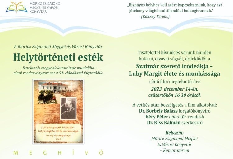 A Helytörténeti esték sorozat következő részében a " Szatmár szerető íródeákja - Luby Margit élete és munkássága" (a Luby Társaság filmje) című filmet mutatják be a Móricz Zsigmond Megyei és Városi Könyvtár Kamaraterében.