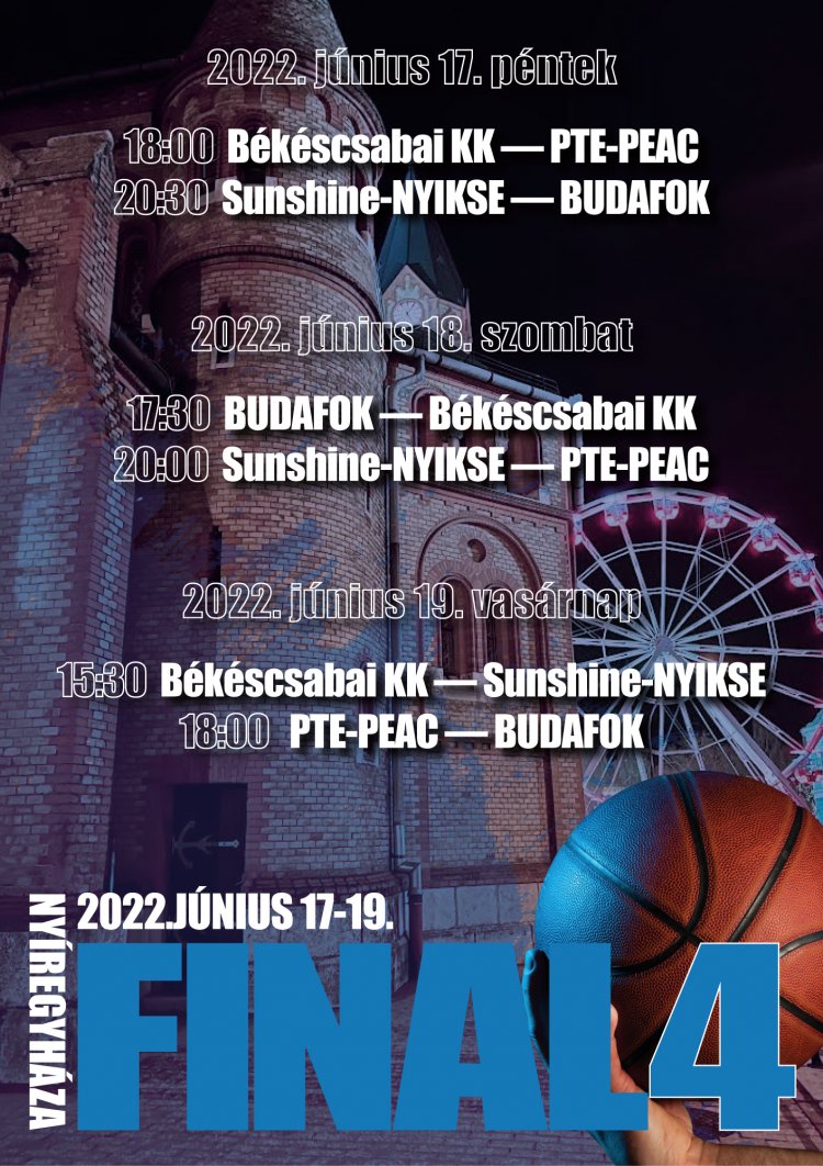 Nyíregyházán rendezik a hétvégén a férfi kosárlabda NB-II négyes döntőjét. A Sunshine NYÍKSE is érintett a tornán, a győztes pedig az NB-I/B-be jut. Pénteken a mieink a Budafok ellen játszanak 20.30-tól a Bánki tornatermében, majd szombaton este 8-tól a PTE-PEAC gárdájával találkoznak. Vasárnap 15.30-tól a Békéscsaba lesz a nyíregyháziak ellenfele. A Sunshine NYÍKSE megnyerte idén a Keleti-csoportot, többek között a Békéscsabát megelőzve, és a tavalyi évhez hasonlóan a legjobb 4 közé jutott a MAFC Martos legyőzésével. Egy éve a harmadik helyen zárt a NYÍKSE.