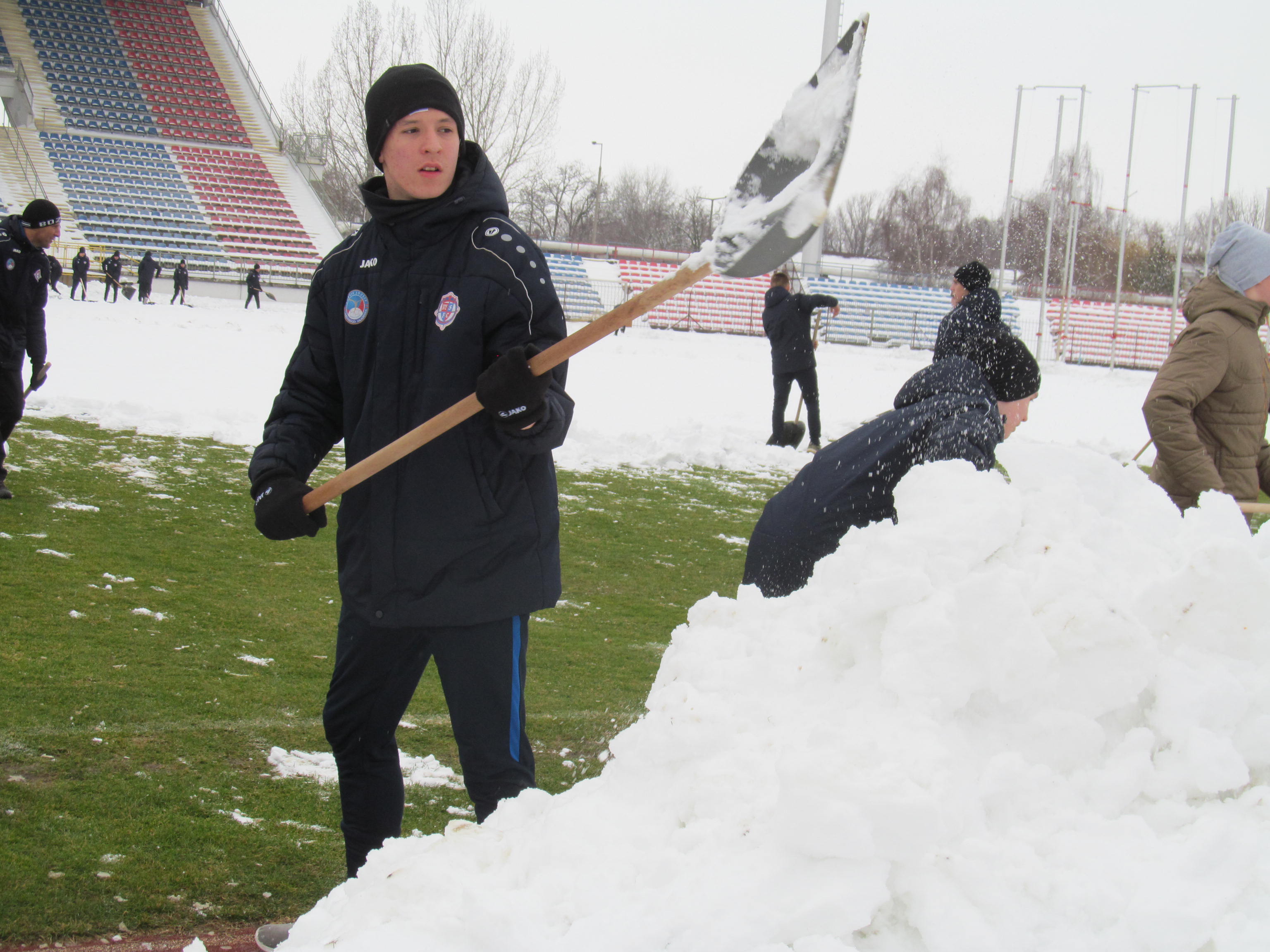 Közösen takarították a havat a Nyíregyházi Stadion centerpályáján a NYÍRVV Nonprofit Kft. munkatársai és a Nyíregyháza Spartacus Bozsik József Labdarúgó Akadémia fiatal játékosai, valamint edzői.