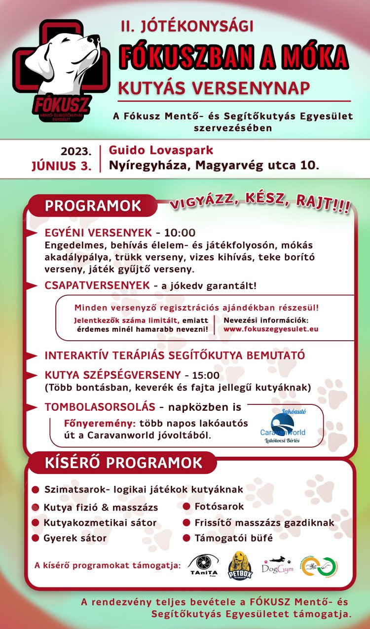 Június 3-án kerül megrendezésre a II. Jótékonysági Fókuszban a Móka Kutyás Versenynap Nyíregyházán a Guido Lovasparkvan. A rendezvény folyamán a Fókusz Mentő- és Segítőkutyás Egyesület működését támogathatják a versenyekre nevezők és a látogatók.