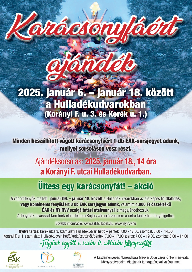 Nyíregyháza Megyei Jogú Város Önkormányzata, az ÉAK Nonprofit Kft. és a NYÍRVV Nonprofit Kft. 2025. január 6. és január 18. között karácsonyfagyűjtő akciót szervez. Az akció ideje alatt minden egyes - Korányi F. u. 3., valamint Kerék u. 1. sz. alatti Hulladékudvarokba – beszállított vágott karácsonyfáért 1 db ÉAK-nyereményszelvényt kapnak a résztvevők, amivel sorsoláson vesznek részt, és ajándékokat nyerhetnek.