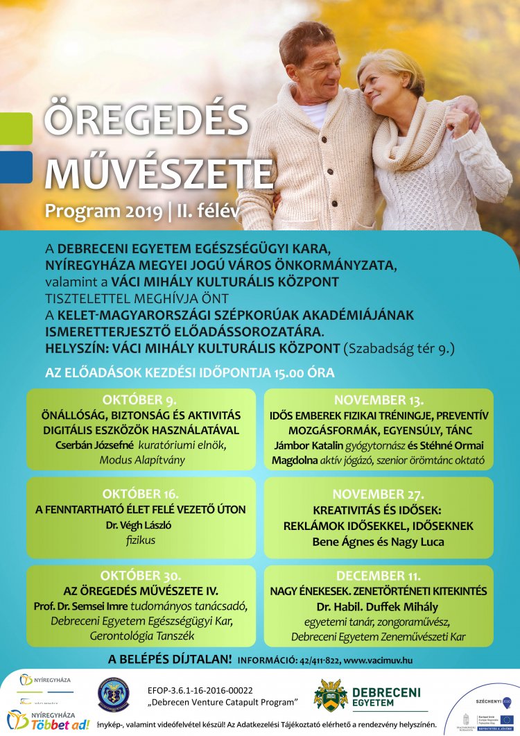 A Kelet-Magyarországi Szépkorúak Akadémiájának ismeretterjesztő előadássorozata október 9-től folytatódik. A II. félévben hat előadás nyújt tartalmas kikapcsolódást a szépkorú városlakóknak.