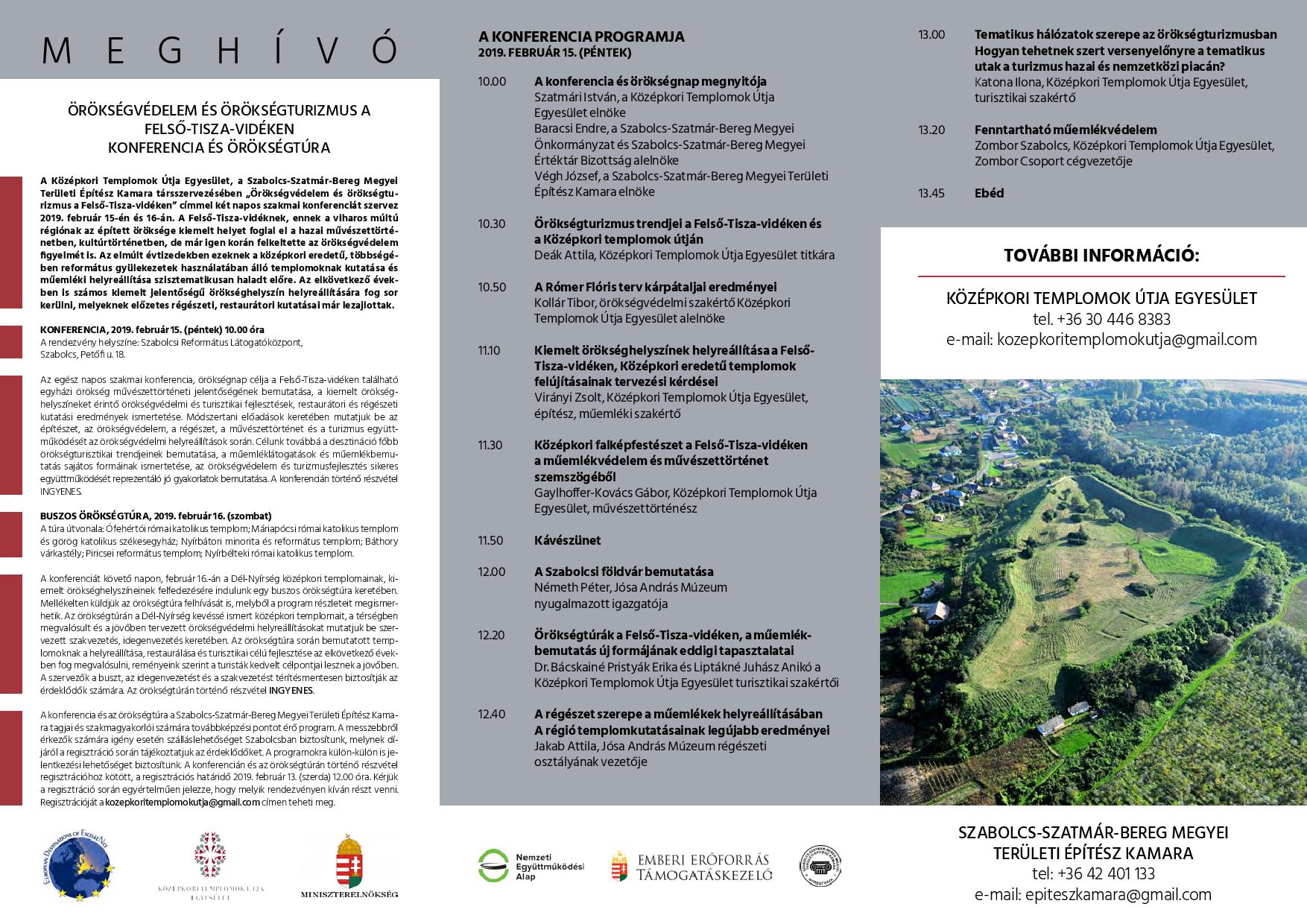 A rendezvény első napján, február 15-én konferenciát tartunk (a helyszín: Szabolcsi Református Látogatóközpont, Szabolcs, Petőfi u. 18.), melynek célja a Felső-Tisza-vidéken található egyházi örökség művészettörténeti jelentőségének bemutatása, a kiemelt örökséghelyszíneket érintő örökségvédelmi és turisztikai fejlesztések, restaurátori és régészeti kutatási eredmények ismertetése.