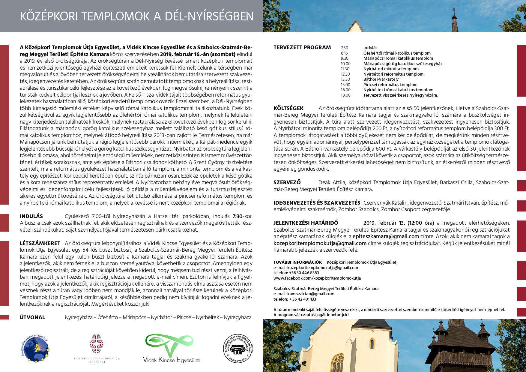 Másnap buszos örökségtúrán vehetnek részt az érdeklődők, akik a Dél-Nyírség középkori templomait fedezhetik fel, illetve tájékoztatást kapnak a térségben tervezett helyreállításokról. Az útvonal: Ófehértói római katolikus templom; Máriapócsi római katolikus templom és görög katolikus székesegyház; Nyírbátori minorita és református templom; Báthory várkastély; Piricsei református templom; Nyírbélteki római katolikus templom; Nyírmihálydi református templom.