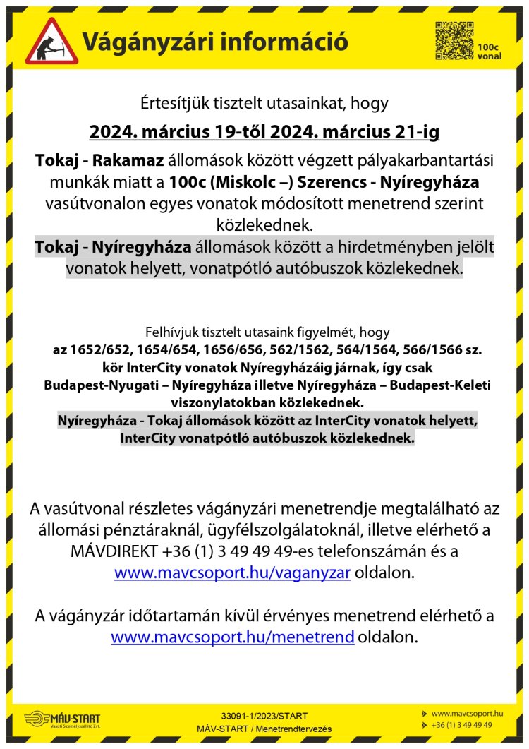 Március 19-től és március 24-ig Tokaj és Rakamaz között pályakarbantartási munkálatokat végeznek. A munkák érintik a 80 Budapest- Füzesabony-Miskolc vasútvonalat, és ezért egyes vonatok módosított menetrend szerint közlekednek.