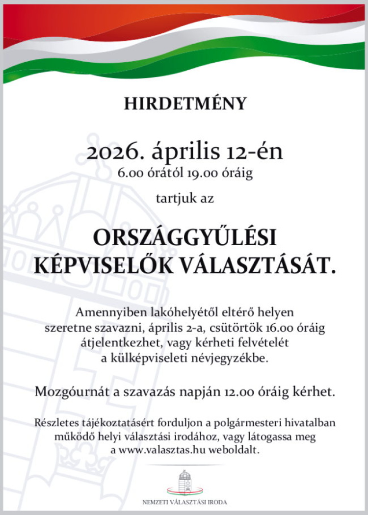 Magyarország köztársasági elnöke az országgyűlési képviselők 2026. évi általános választását 2026. április 12-re, vasárnapra tűzte ki. A választópolgárok ezen a napon 6 és 19 óra között adhatják le szavazatukat, főszabály szerint a lakcímük szerinti szavazókörben. A szavazás személyesen történik, a szavazatszámláló bizottság előtt érvényes személyazonosító okmány bemutatásával.