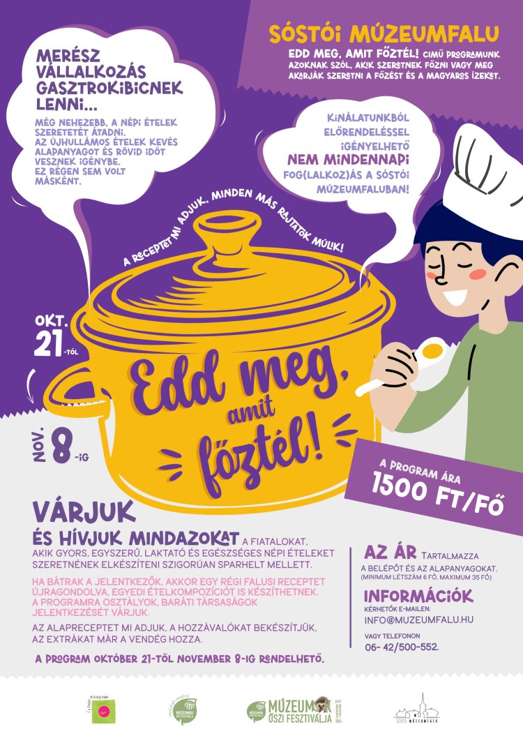 Gasztro időutazás? Akár! A Sóstói Múzeumfaluban október 21-e és november 8-a között várják azokat az érdeklődőket, akik kipróbálnák magukat nagymamáink konyhájában. Hamisítatlan házias ízeket lehet majd elkészíteni, természetesen a helyi szakértők segítségével, "Edd meg, amit főztél" felkiáltással!