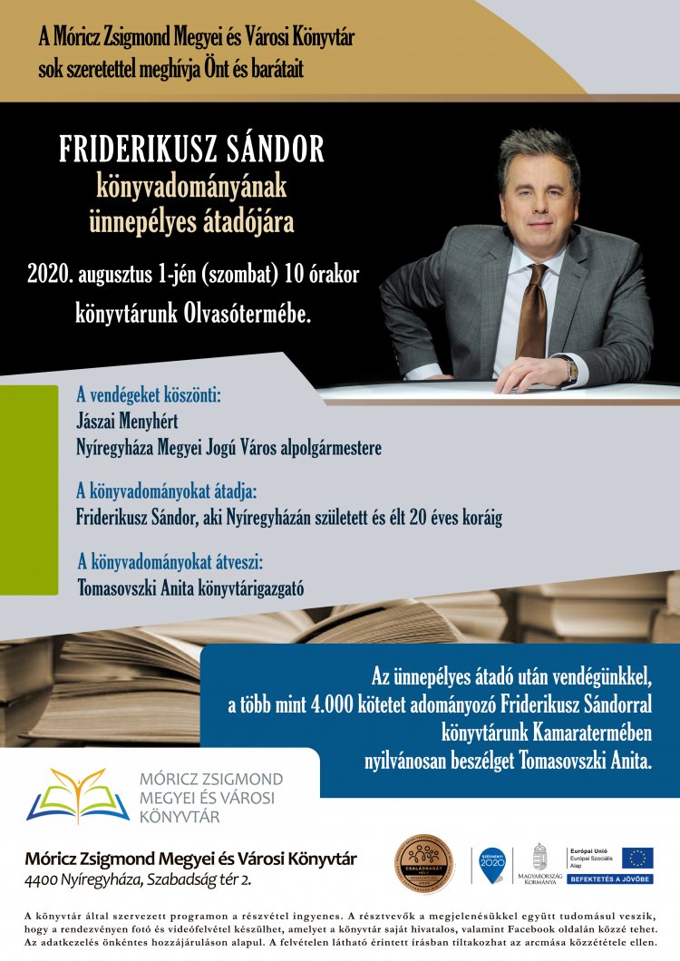 Több mint négyezer kötetet adományozott Friderikusz Sándor a Móricz Zsigmond Megyei és Városi Könyvtárnak. A könyvadományokat Nyíregyháza szülötte, a Joseph Pulitzer-emlékdíjas, Prima Primissima díjas magyar újságíró, riporter, televíziós műsorvezető és szerkesztő augusztus 1-jén adja át a megyei könyvtár igazgatójának. Az ünnepélyes átadó után Tomasovszki Anita könyvtárigazgató beszélget Friderikusz Sándorral, a kamarateremben. A rendezvény nyilvános.