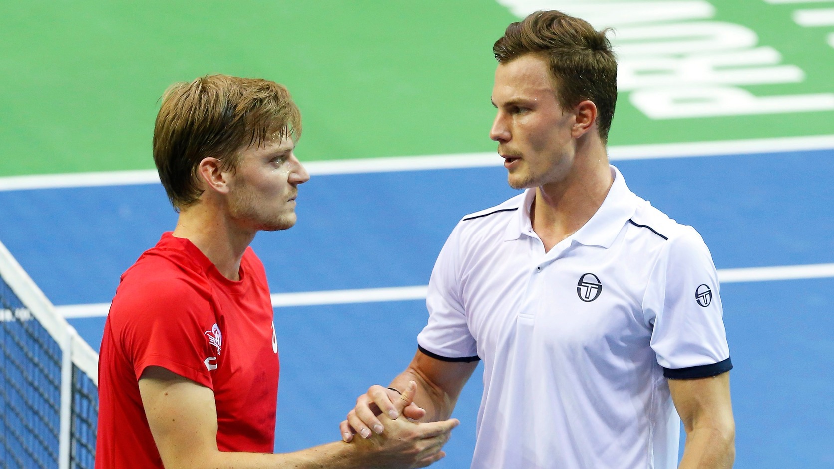 David Goffin és Fucsovics Márton a Davis-kupa világcsoportjának belga-magyar nyolcaddöntőjében 2018. február 4-én (MTI/EPA/Julien Warnand)