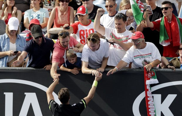 Fucsovics Márton fogadja a szurkolók gratulációját, miután 6-3, 6-3, 6-2 arányban győzött az argentin Nicolas Kicker ellen az ausztrál nyílt teniszbajnokság férfi egyesének harmadik fordulójában Melbourne-ben 2018. január 20-án (Fotó: MTI/AP/Dita Alangkara)