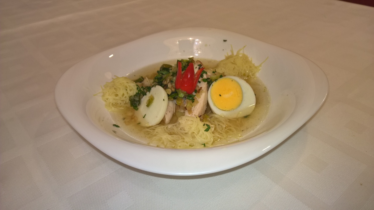 A tyúkot vízben feltesszük főzni, hozzáadva a szeletelt zöldhagymát, sót, borsot, koriandert, gyömbért. A tyúkot addig főzzük, míg meg nem puhult. A húst később metéltre vágjuk. Az elkészült lébe beletesszük a szardíniapasztát és citromlével ízesítjük. Elkészítjük a levesbetétet, a főtt burgonyát vastagabb metéltre vágjuk, rákarikázzuk a kemény tojás szeleteket, hozzáadjuk a főtt finom metéltet. A vöröshagymát lepirítjuk, hozzáadjuk a zöldhagymát, az őrölt mandulát és amikor elkészült, a levesbetétre tesszük, ráhelyezzük a metéltre vágott tyúkhúst és a levest rámerve fogyasszuk.