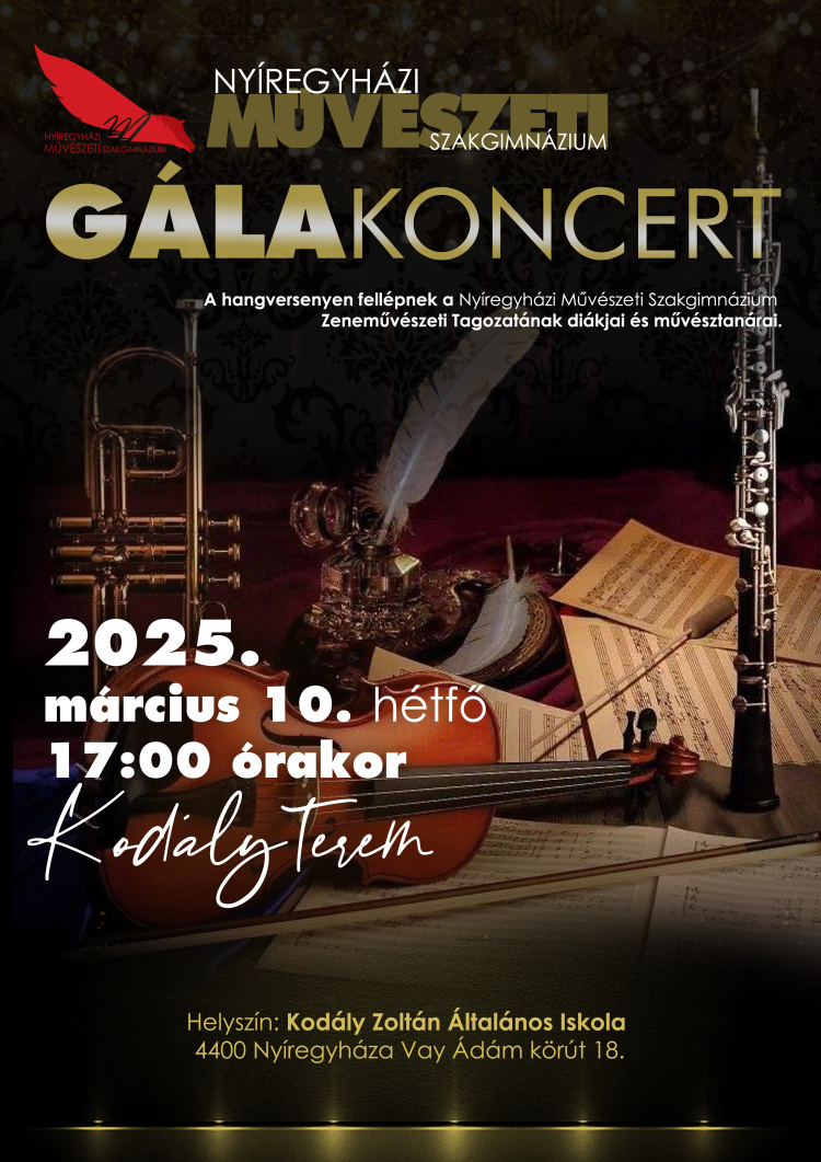 2025-ben is színvonalas kikapcsolódásban lesz részük azoknak, akik 2025. március 10-én, hétfőn 17 órától részt vesznek a Művészeti Gálakoncertjén. A hagyományokhoz hűen ismét láthatja és hallhatja a közönség a klasszikus zenész, a népzenész és a színész növendékeket, akik művésztanáraik közreműködésével varázsolnak majd csodás pillanatokat a Vay Ádám körúti hangversenyterem falai közé.