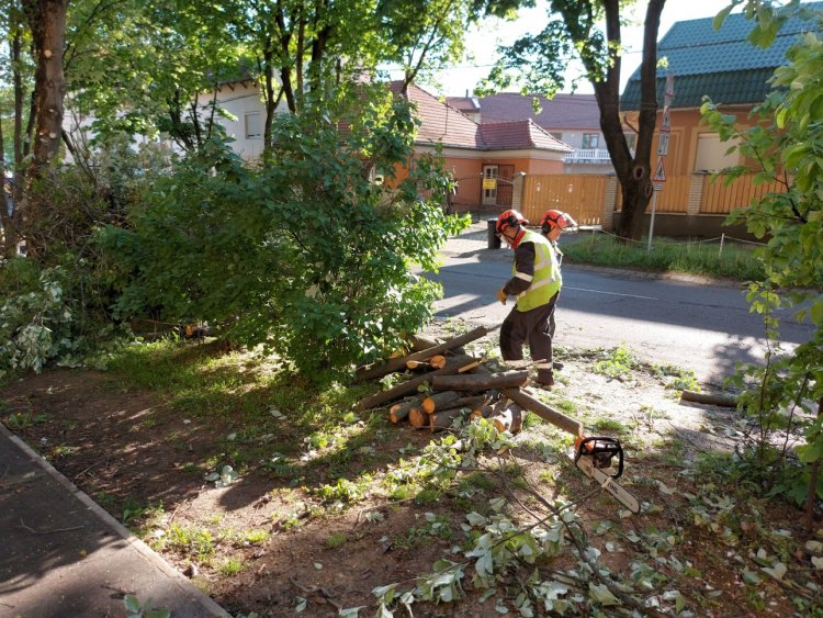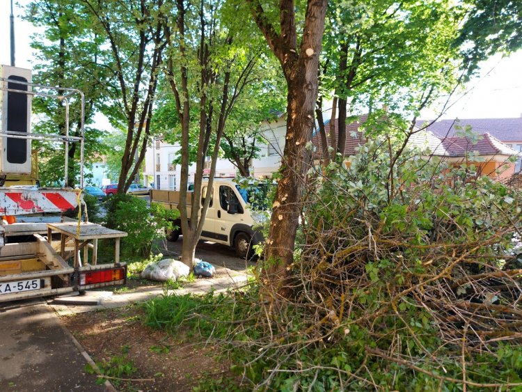 Az Ady Endre utcán forgalomkorlátozás mellett végeztek gallyazási munkákat a NYÍRVV szakemberei, emelőkosaras munkagépből.