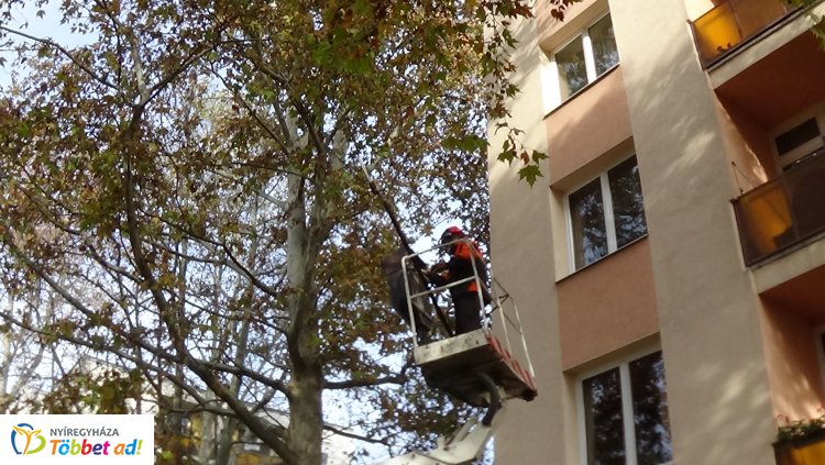 Platánfákat gallyaztak az Árpád utcán a NYÍRVV szakemberei, emelőkosárból végezték a munkálatokat, amelyek várhatóan még csütörtökön is tartanak.