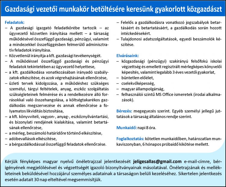 Gazdasági vezetői munkakör betöltésére keresnek gyakorlott közgazdászt