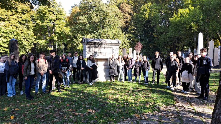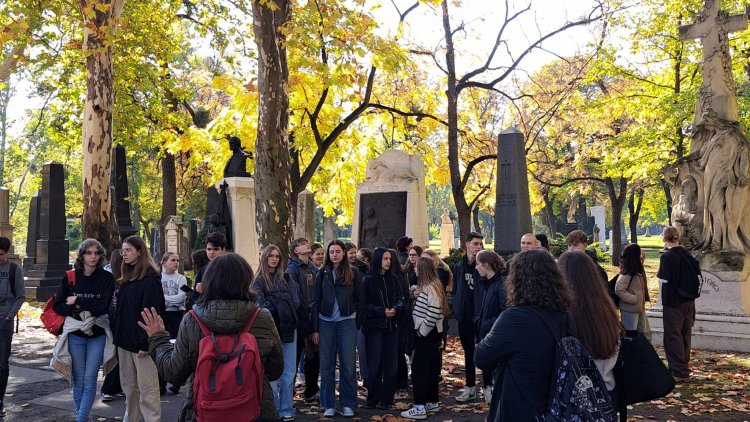 „A délelőtt folyamán a Fiumei úti nemzeti sírkertben tettünk látogatást. Itt a Nemzeti Örökség Intézete által szervezett Memento’56 – Diáknap a Fiumei úti sírkertben programba kapcsolódtunk be. Ennek a programnak a célja, hogy a fiatalok a történelem emblematikus helyszínein felidézzék múltunk kiemelkedő eseményeit, ezzel is erősítve bennük a nemzeti érzést. A diákok a NÖRI egyik munkatársának előadását is meghallgatták, melyben fontos ismereteket kaptak az 1956-os forradalom-és szabadságharcban elhunytak sírhelyeiről. Ezt követően a sírkert 21-es parcellájában megkoszorúztuk az 56-os polgári áldozatok emlékére emelt kopjafát és megtekintettük a Mártíremlékművet is. A program végén a magyar történelem és kultúra nagyjainak síremlékei között sétáltunk.”