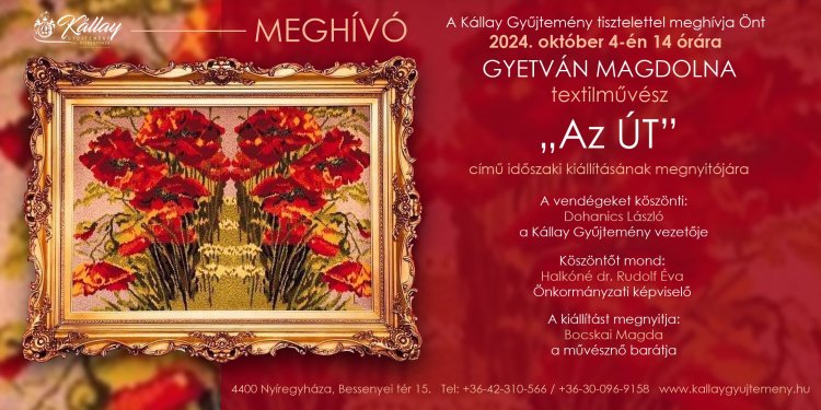 Október 4-én, 14.00-kor nyílik meg Gyetván Magdolna textilművész "Az út" című időszaki kiállítása a Kállay Gyűjteményben.