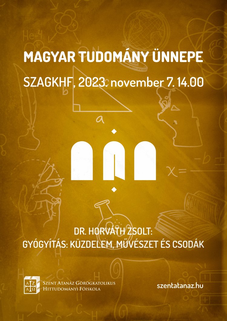 A Szent Atanáz Görögkatolikus Hittudományi Főiskola tisztelettel meghívja Önt 2023. november 7-én kedden a Magyar Tudomány Ünnepe alkalmából a Pedagógiai- és Pszichológiai Központ által szervezett „GYÓGYULÁS ES MEGVÁLTÁS A VALLÁS ÉS TUDOMÁNY PÁRBESZÉDÉBEN” konferenciájára.