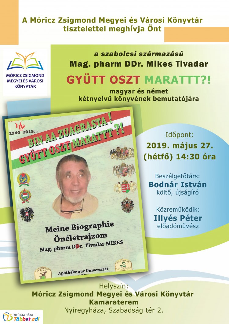 A szabolcsi származású Mag. pharm DDr. Mikes Tivadar magyar és német nyelvű könyvének bemutatójára várják az érdeklődőket május 27-én, a Móricz Zsigmond könyvtárba.