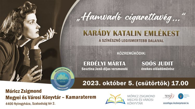 Tetszenek még emlékezni Karády Katalinra. Fel tudják idézni a hangját, hanszínét? Látják lelki szemeik előtt a tekintetét? Erdélyi Márta, Sesztina Jenő-díjas versmondó, valamint Soós Judit, énekes-elóadóművész a legendás színésznő legismertebb dalait adják elő a Móricz Zsigmond Megyei és Városi Könyvtárban.
